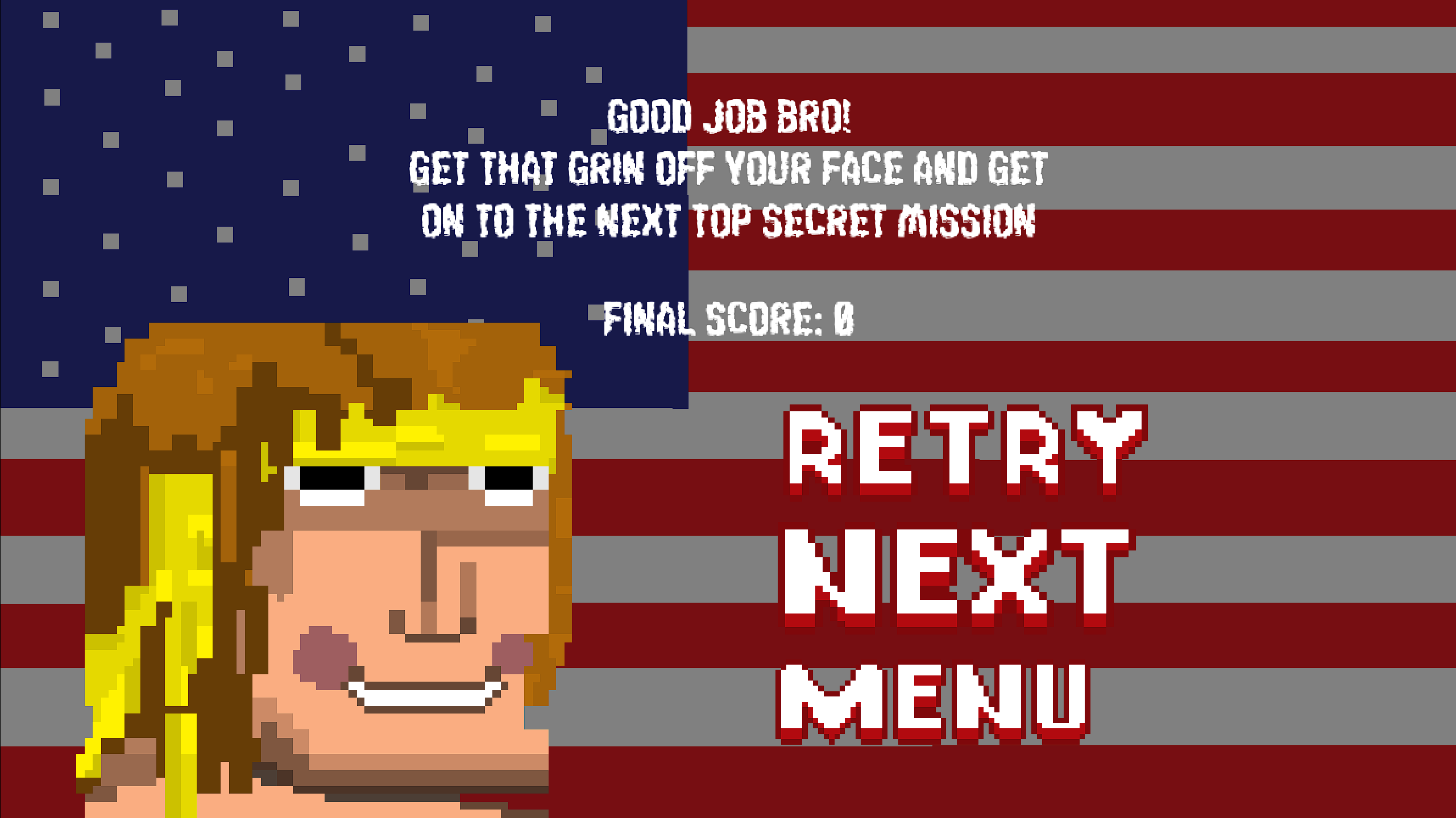 Blast your way through destructible battlegrounds, mow down the enemies of freedom, and get to the flag of justice at the end of every level. No diplomacy. No bureaucracy. Just bullets, explosions, and good ol' American vengeance.